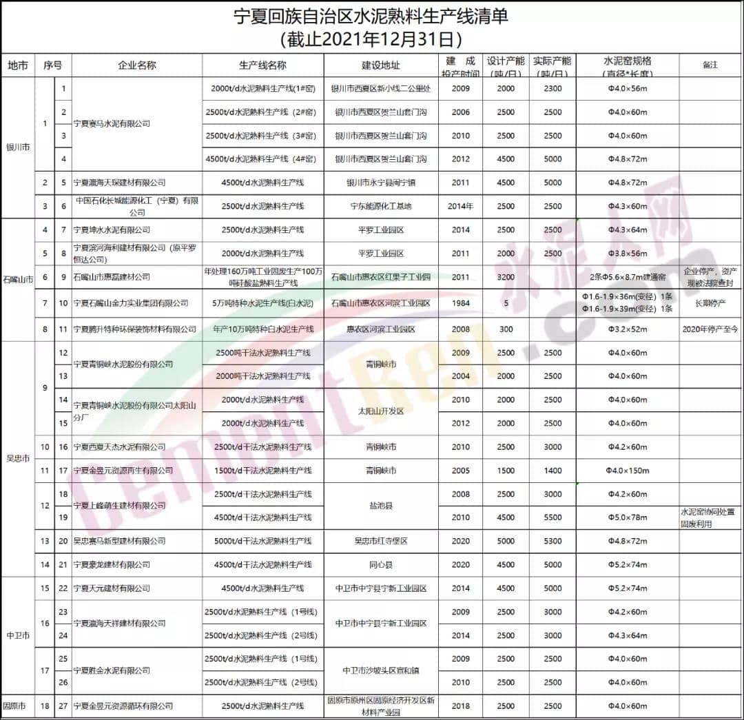 附件:寧夏回族自治區(qū)2021年度水泥熟料、平板玻璃生產線清單