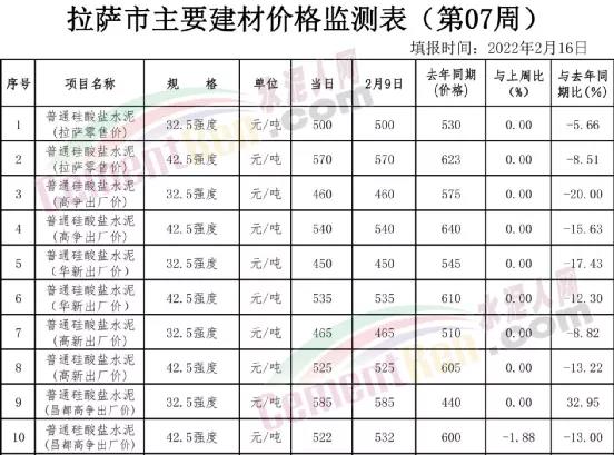 日前,西藏自治區(qū)發(fā)改委價(jià)格監(jiān)測(cè)中心發(fā)布了2022年第7周(2月10日至2月16日)拉薩市場(chǎng)主要建材價(jià)格周報(bào)。