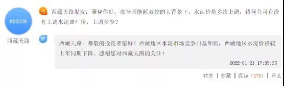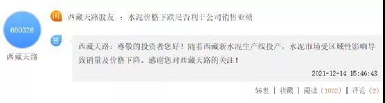 此前,西藏天路在上市平臺(tái)回復(fù)投資者提問(wèn)時(shí)也曾多次提到,西藏地區(qū)水泥市場(chǎng)競(jìng)爭(zhēng)日益加劇,西藏地區(qū)水泥價(jià)格較上年同期下降。