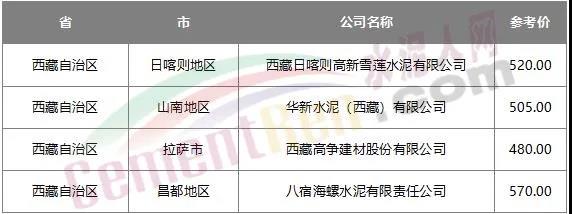 據(jù)水泥人網(wǎng)信息中心數(shù)據(jù),近日西藏自治區(qū)主要品牌水泥報(bào)價(jià)在480~570元/噸之間。