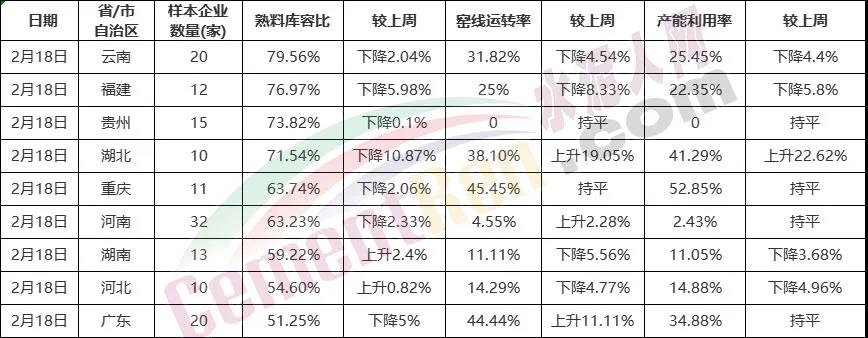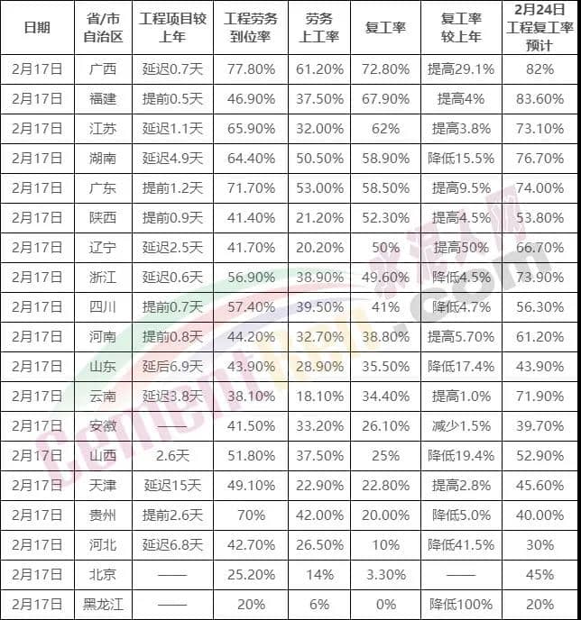 工程方面,以上19個省市自治區(qū)中福建、廣東、陜西 、四川、河南、貴州等6個省較上年同期有所提前,其中貴州省提前了2.6天。黑龍江、河北、貴州、山東、山西、四川、浙江、湖南等省復(fù)工率較上年均有降低,黑龍江工程復(fù)工率為0,工程勞動到位率僅為20%。預(yù)計(jì)本月24日前后,上述19個省市自治工程復(fù)工率最高可達(dá)80%。