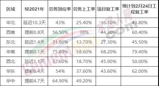 分區(qū)域來看,華中地區(qū)較2021年提前了4.7天,勞務(wù)到位率及上工率達(dá)到64.9%、49.2%;華南地區(qū)勞務(wù)到工率達(dá)到75.8%,上工率達(dá)到58.6%。