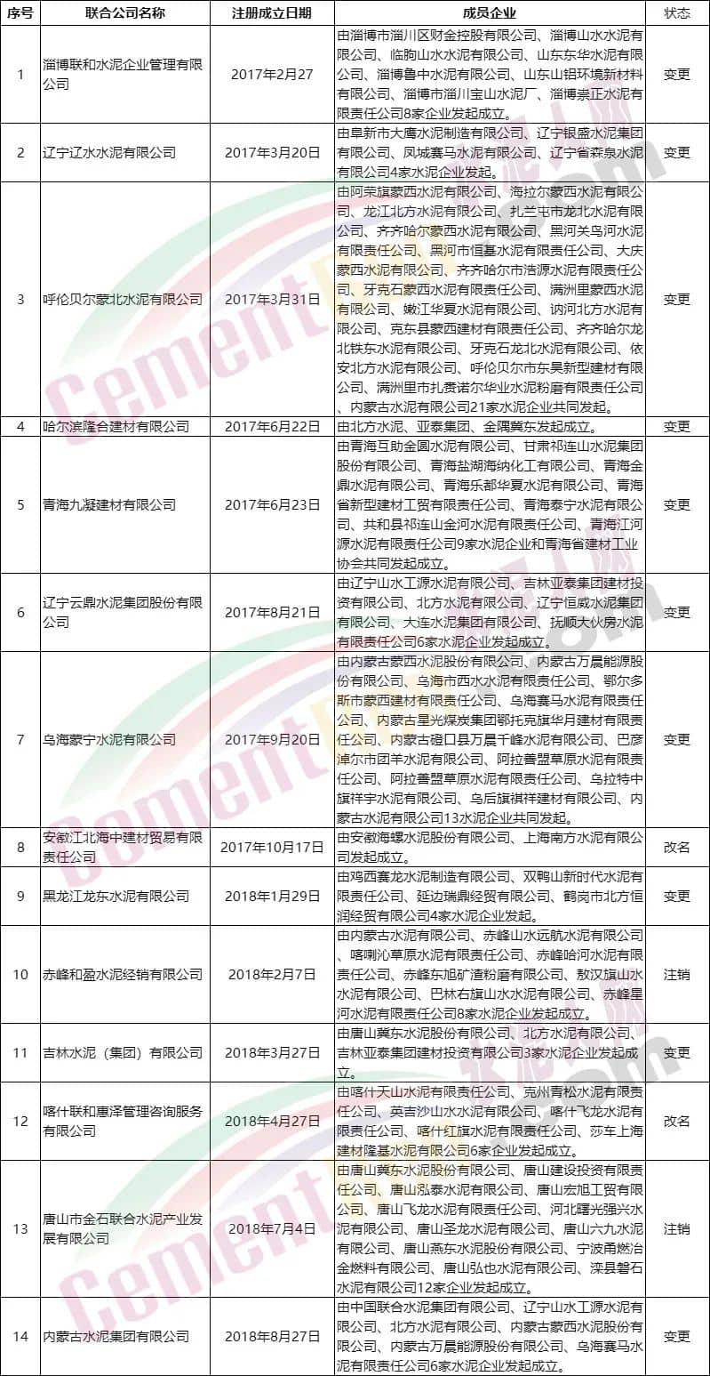 據(jù)查詢,自2017年以來國內(nèi)行業(yè)成立的水泥區(qū)域聯(lián)合公司共14家。