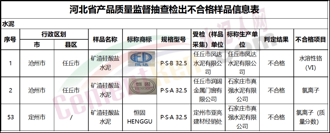 河北省市場監(jiān)管局抽查水泥產(chǎn)品檢出不合格樣品3批次。 不合格項目分別為水溶性鉻(VI)、氯離子以及氯離子(質(zhì)量分?jǐn)?shù))。