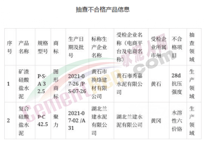 湖北省市場監(jiān)管局通報兩個批次水泥產(chǎn)品不合格,不合格項目為28天抗壓強(qiáng)度、水溶性六價鉻。