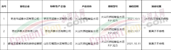 山東省棗莊市市場監(jiān)督管理局公布水泥質(zhì)量抽查結(jié)果顯示3批次出現(xiàn)不合格。不合格項目為28天抗壓強(qiáng)度和氯離子,不合格品標(biāo)稱企業(yè)為棗莊市誠意水泥有限公司、棗莊廬泰水泥有限公司、山東石榴園水泥有限公司。