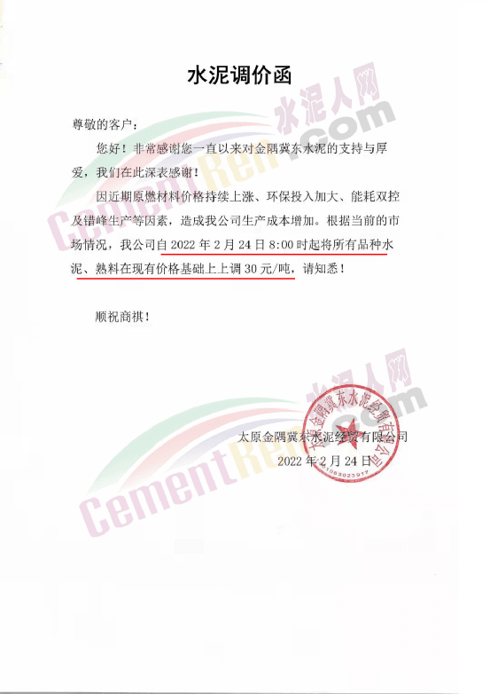 水泥人網(wǎng)通訊員消息:日前,太原金隅冀東水泥經(jīng)貿(mào)有限公司通知,因近期原燃材料價(jià)格持續(xù)上漲、環(huán)保投入加大、能耗雙控及錯(cuò)峰生產(chǎn)等因素,造成公司生產(chǎn)成本增加。根據(jù)當(dāng)前的市場(chǎng)情況,公司自2022年3月2日8時(shí)起將大同冀東、廣靈金隅和代縣環(huán)保水泥P.O42.5散出廠價(jià)調(diào)整為460元/噸,其他品種水泥在此基礎(chǔ)上對(duì)應(yīng)同步上調(diào)價(jià)格。