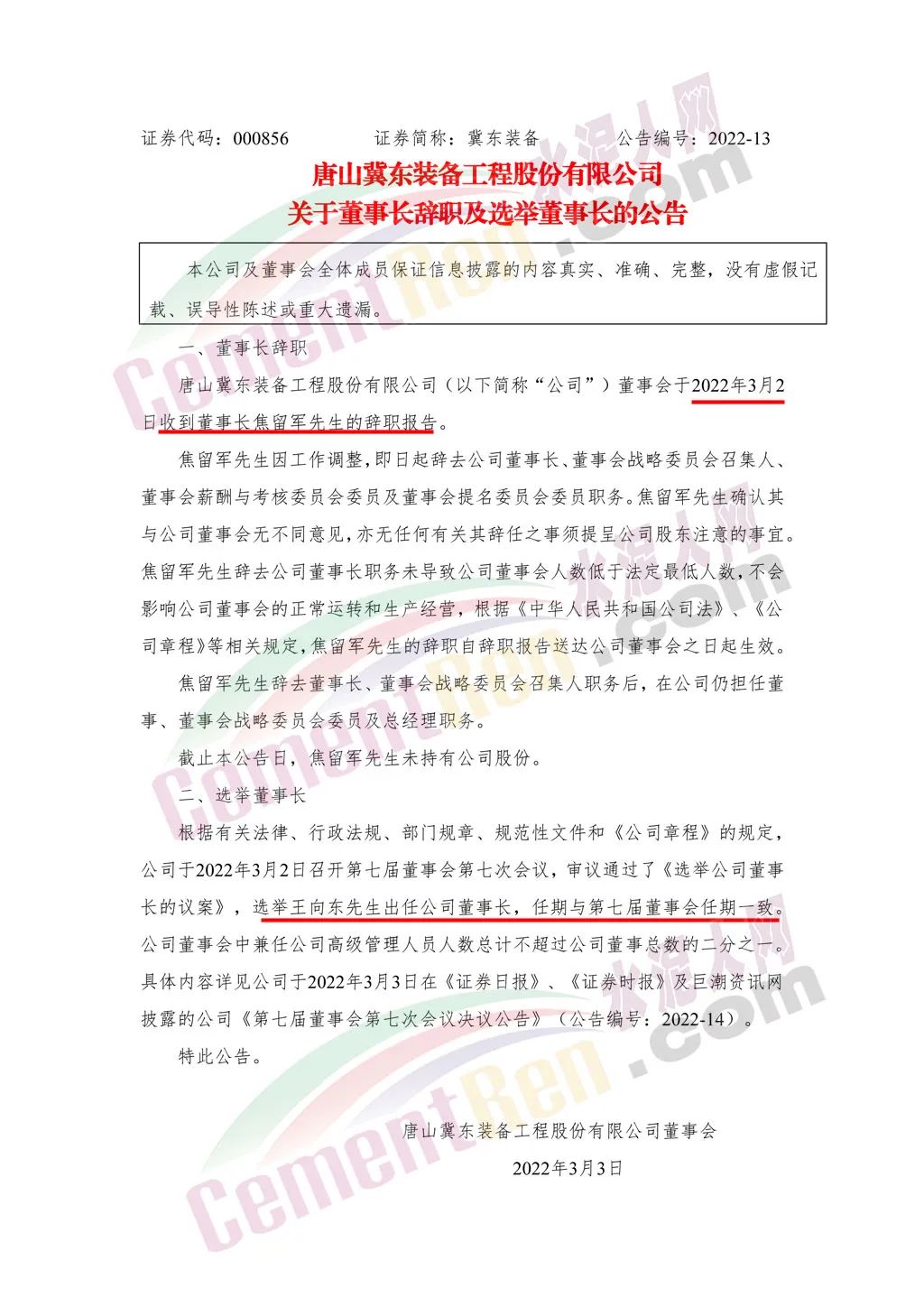 冀東裝備3月2日晚間公告,公司董事會于2022年3月2日收到董事長焦留軍的辭職報告。焦留軍因工作調(diào)整,即日起辭去公司董事長、董事會戰(zhàn)略委員會召集人、董事會薪酬與考核委員會委員及董事會提名委員會委員職務(wù)。焦留軍辭去董事長、董事會戰(zhàn)略委員會召集人職務(wù)后,在公司仍擔(dān)任董事、董事會戰(zhàn)略委員會委員及總經(jīng)理職務(wù)。