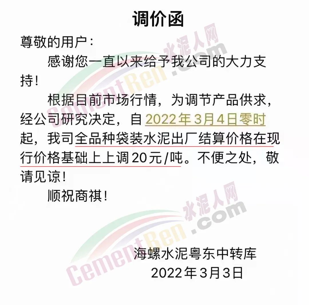 日前,海螺水泥粵東中轉(zhuǎn)庫通知:根據(jù)目前市場行情,為調(diào)節(jié)產(chǎn)品供求,經(jīng)公司研究決定自2022年3月4日零時起,公司全品種袋裝水泥出廠結(jié)算價格在現(xiàn)行價格基礎(chǔ)上上調(diào)20元/噸。