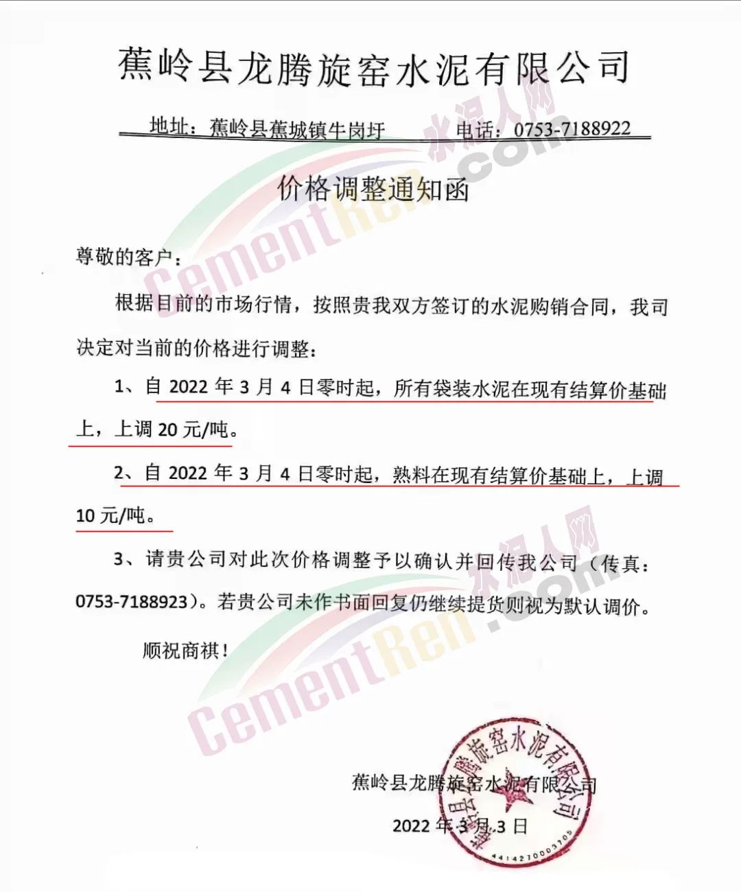 蕉嶺縣龍騰旋窯水泥有限公司通知,根據(jù)目前的市場行情,決定對當前的價格進行調(diào)整。自2022年3月4日零時起,所有袋裝水泥在現(xiàn)有結(jié)算價基礎(chǔ)上上調(diào)20元/噸,熟料在現(xiàn)有結(jié)算價基礎(chǔ)上上調(diào)10元/噸。