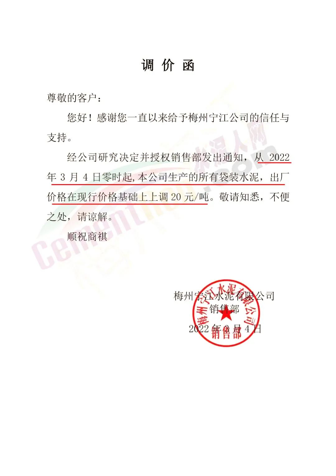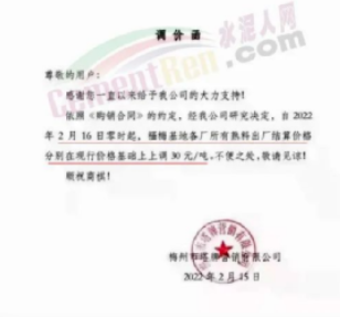 梅州寧江水泥有限公司銷售部通知,經(jīng)公司研究決定并授權(quán)銷售部發(fā)出通知,從2022年3月4日零時起,本公司生產(chǎn)的所有袋裝水泥,出廠價格在現(xiàn)行價格基礎(chǔ)上上調(diào)20元/噸。