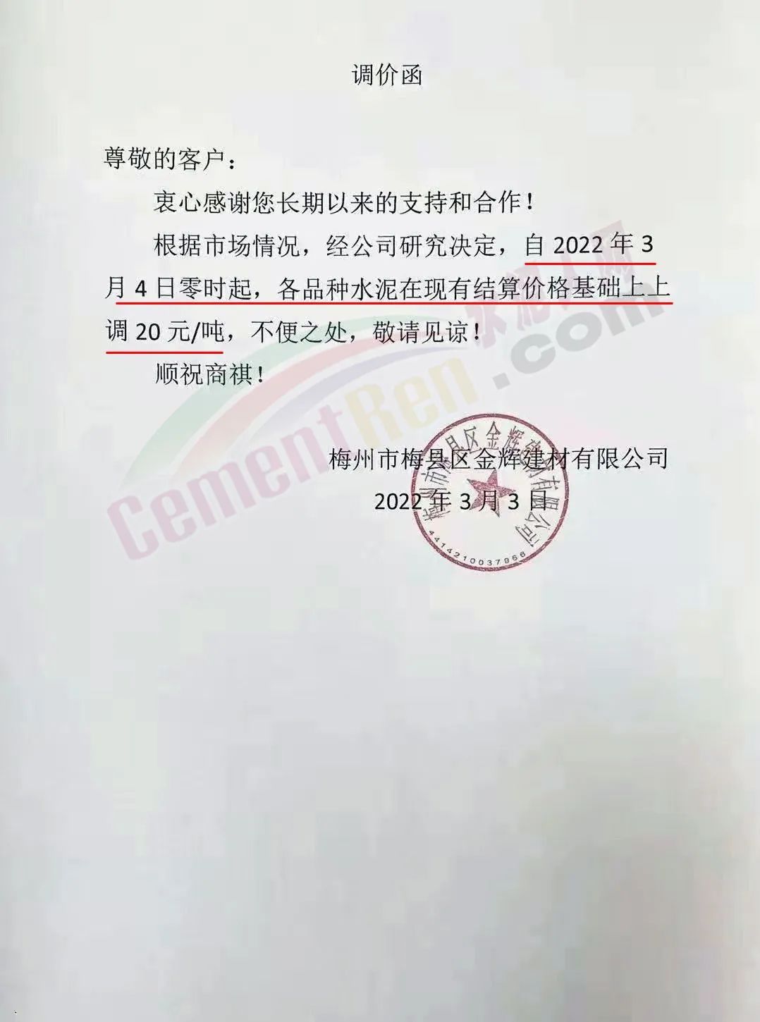 梅州市梅縣區(qū)金輝建材有限公司通知,根據(jù)市場情況,經(jīng)公司研究決定,自2022年3月4日零時起,各品種水泥在現(xiàn)有結(jié)算價格基礎(chǔ)上上調(diào)20元/噸。