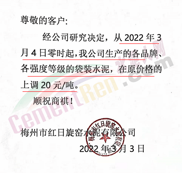 梅州市紅日旋窯水泥有限公司通知從2022年3 月4日零時起,各品牌、各強度等級的袋裝水泥,在原價格的上調(diào) 20元/噸。
