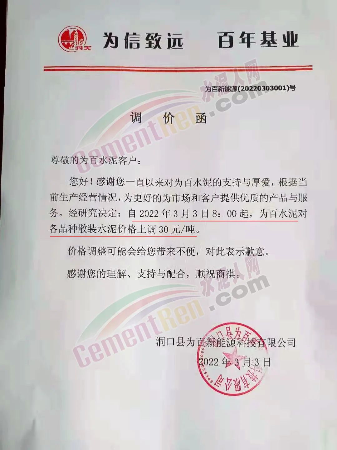 湖南省邵陽市洞口縣為百新能源料技有限公司通知,根據(jù)當前生產(chǎn)經(jīng)營情況,為更好的為市場和客戶提供優(yōu)質(zhì)的產(chǎn)品與服務。經(jīng)研究決定自 2022年3月3日8時起,為百水泥對各品種散裝水泥價格上調(diào)30元/噸。