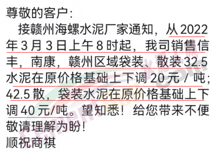 江西贛州海螺水泥經(jīng)銷商發(fā)通知稱,接贛州海螺水泥廠家通知,從2022 年3月3日上午8時起,公司銷售信豐、南康、贛州區(qū)域袋裝、散裝32.5水泥在原價格基礎(chǔ)上下調(diào)20元/噸;42.5散、袋裝水泥在原價格基礎(chǔ)上下調(diào)40元/噸。
