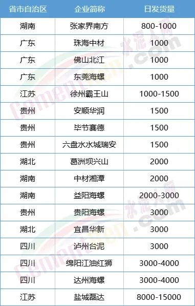 據(jù)水泥人網(wǎng)通訊員反饋,近期湖南、湖北、江蘇、廣東、貴州等多區(qū)域水泥企業(yè)日出貨量均在1000-3000噸之間。