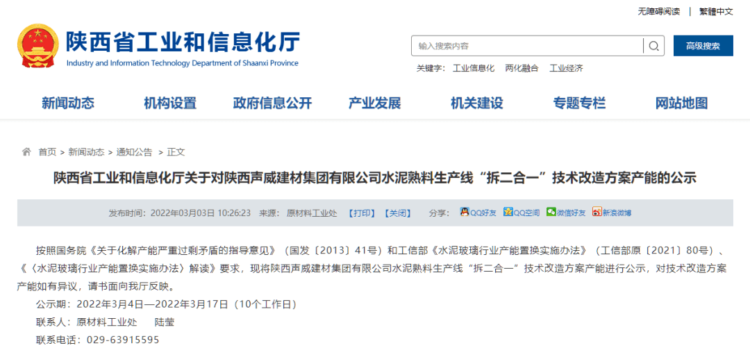 3月3日,陜西省工業(yè)和信息化廳發(fā)布《關(guān)于對(duì)陜西聲威建材集團(tuán)有限公司水泥熟料生產(chǎn)線“拆二合一”技術(shù)改造方案產(chǎn)能的公示》 。公示內(nèi)容顯示陜西聲威建材集團(tuán)有限公司擬通過(guò)拆除退出兩條2500t/d熟料生產(chǎn)線,在原廠區(qū)內(nèi)新建一條4500t/d新型干法水泥熟料生產(chǎn)線,配套協(xié)同處置500t/d生產(chǎn)垃圾項(xiàng)目。新建生產(chǎn)線將采用第二代新型干法水泥技術(shù)和裝備 ,計(jì)劃于2023年7月點(diǎn)火投產(chǎn)。