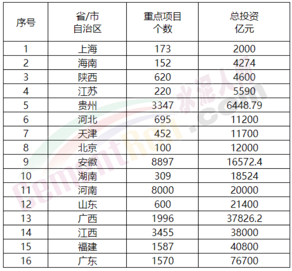 部分省市自治區(qū)重點(diǎn)項(xiàng)目數(shù)量及總投資金額