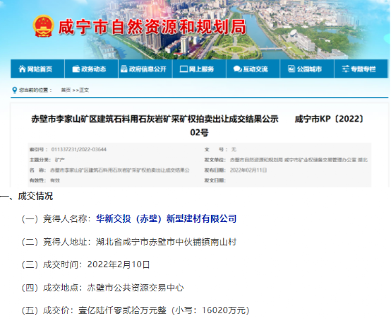 2月10日前后華新水泥控股企業(yè)華新交投(赤壁)新型建材有限公司以16020萬元競得赤壁市李家山礦區(qū)建筑石料用石灰?guī)r礦采礦權(quán)。該礦山資源儲量為13652.4萬噸。