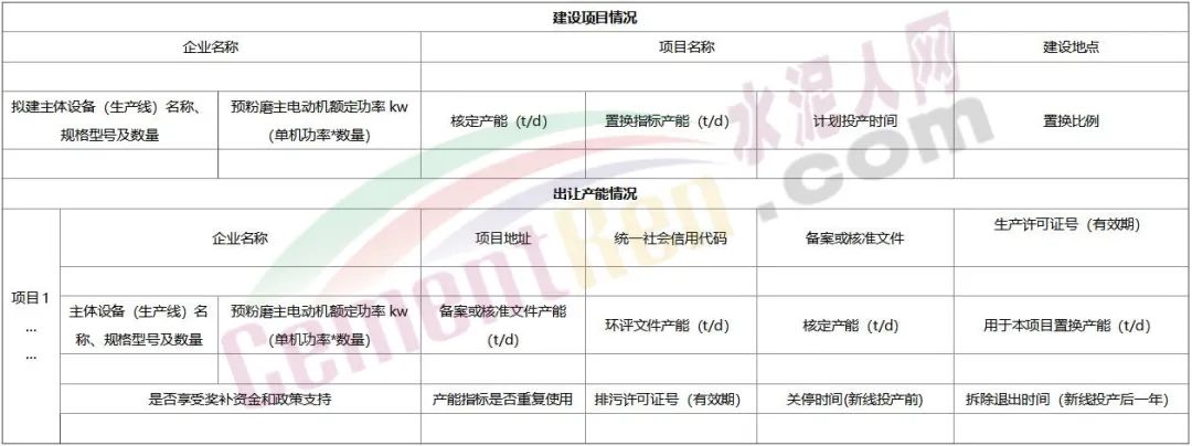 (二)用于置換的產(chǎn)能所屬企業(yè)名稱,統(tǒng)一社會信用代碼,主體設(shè)備(生產(chǎn)線)所在具體位置,企業(yè)的水泥生產(chǎn)許可證號及有效期,主體設(shè)備(生產(chǎn)線)名稱、規(guī)格型號及數(shù)量,備案或核準(zhǔn)文件上的設(shè)計(jì)產(chǎn)能,實(shí)際產(chǎn)能,核定產(chǎn)能,用于本項(xiàng)目置換產(chǎn)能,計(jì)劃關(guān)停時(shí)間,計(jì)劃拆除時(shí)間。