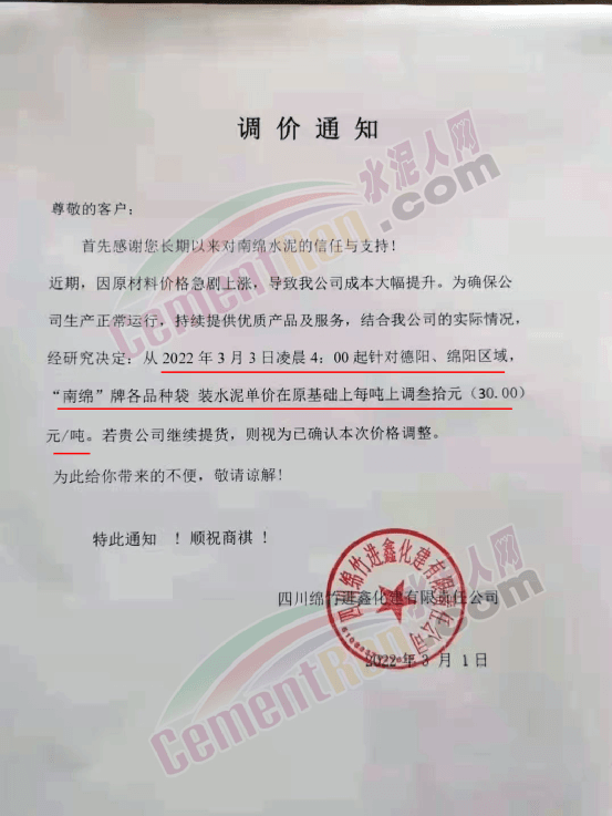 四川綿竹進鑫化建有限責任公司通知稱從2022年3月3日凌晨4時起針對德陽、綿陽區(qū)域,“南綿”牌各品種袋裝水泥單價在原基礎(chǔ)上上調(diào)30元/噸。