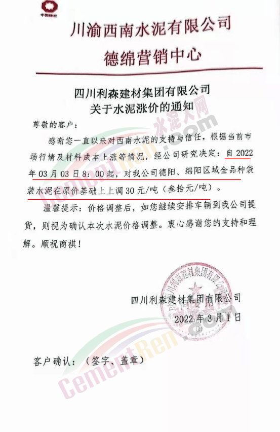 四川國大水泥有限公司通知自2022年3月3日8時起,對公司德陽、綿陽區(qū)域全品種袋裝水泥在原價基礎(chǔ)上上調(diào)30元/噸。