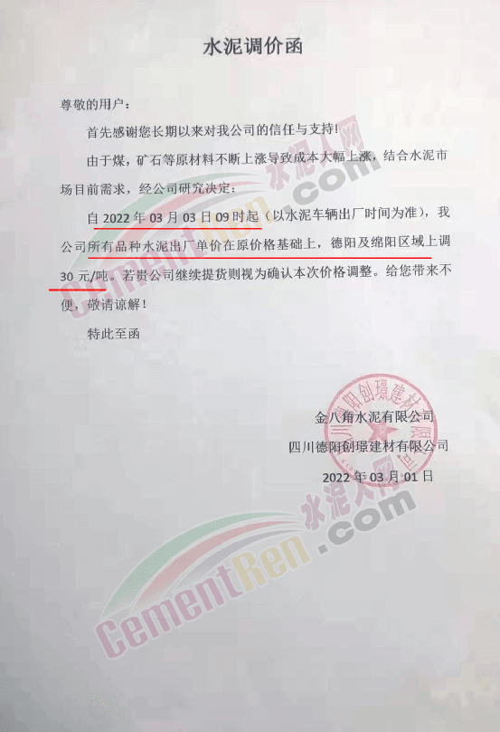 金八角水泥有限公司四川德陽創(chuàng)璟建材有限公司通知自2022年3月3日9時起公司所有品種水泥出廠單價在原價格基礎(chǔ)上,德陽及綿陽區(qū)域上調(diào)30元/噸。