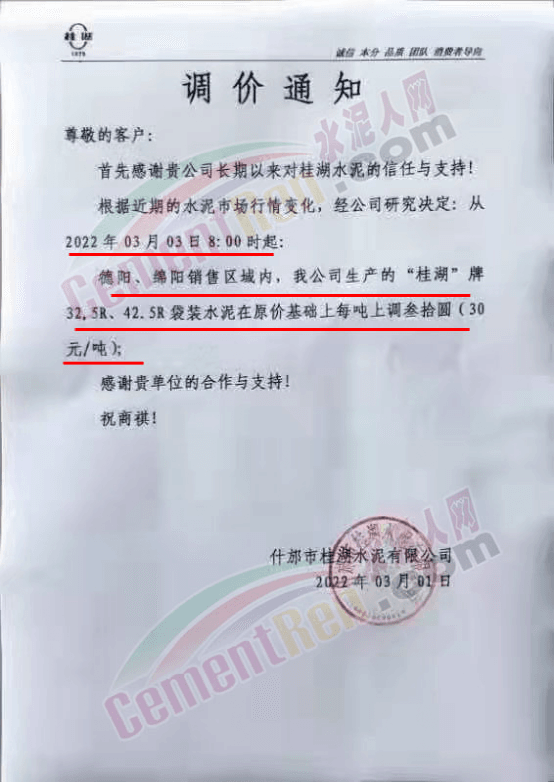 什邡市桂湖水泥有限公司通知從2022年3月3日8時起德陽、綿陽銷售區(qū)域內(nèi),公司生產(chǎn)的“桂湖”牌32.5R、42.5R袋裝水泥在原價基礎(chǔ)上上調(diào)30元/噸。