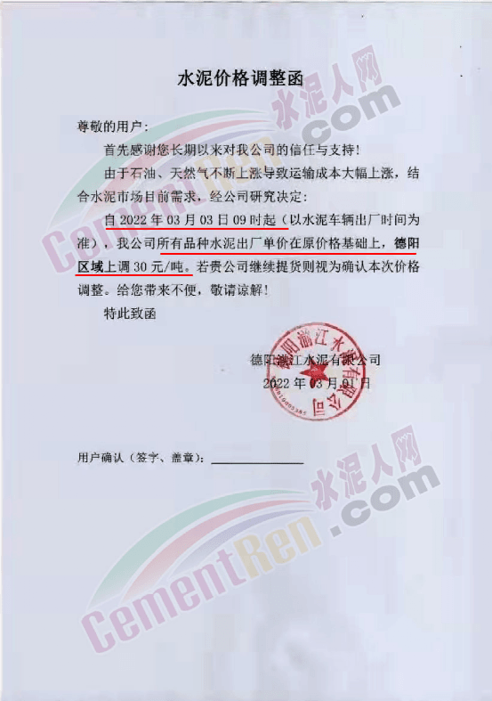 德陽湔江水泥有限公司通知自2022年3月3日9時起公司所有品種水泥出廠單價在原價格基礎(chǔ)上,德陽區(qū)域上調(diào)30元/噸。