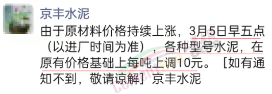山西太原金隅冀東水泥經(jīng)貿(mào)有限公司通知,自2022年3月2日8時起將大同冀東、廣靈金隅和代縣環(huán)保水泥P.O42.5散出廠價調(diào)整為460元/噸,其他品種水泥在此基礎(chǔ)上對應(yīng)同步上調(diào)價格。