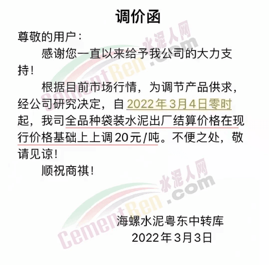 海螺水泥粵東中轉(zhuǎn)庫通知自2022年3月4日零時起,公司全品種袋裝水泥出廠結(jié)算價格在現(xiàn)行價格基礎(chǔ)上上調(diào)20元/噸。