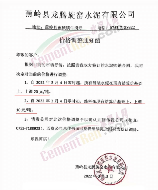 蕉嶺縣龍騰旋窯水泥有限公司通知,自2022年3月4日零時起,所有袋裝水泥在現(xiàn)有結(jié)算價基礎(chǔ)上上調(diào)20元/噸,熟料在現(xiàn)有結(jié)算價基礎(chǔ)上上調(diào)10元/噸。