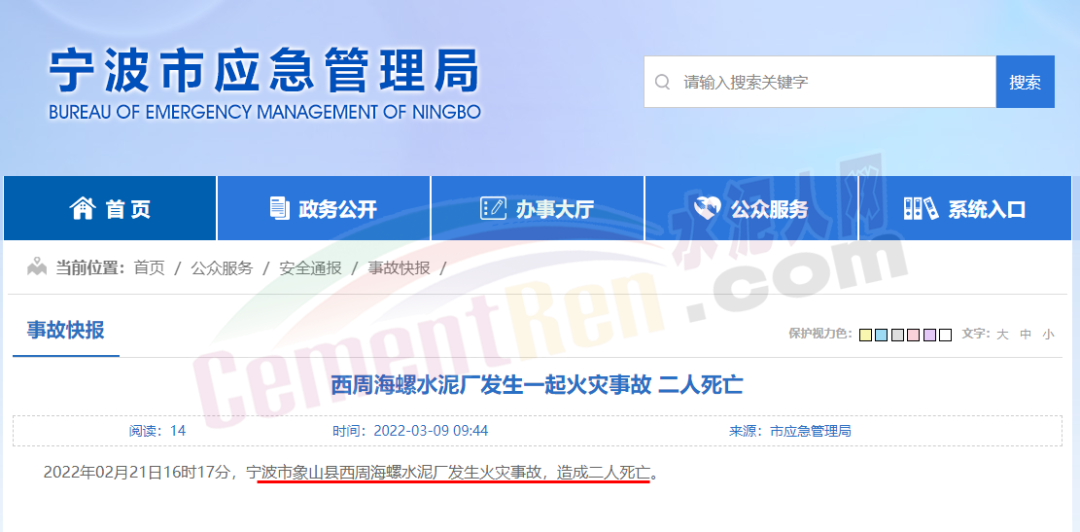 3月9日,浙江省寧波市應(yīng)急管理局發(fā)布消息,2022年02月21日16時(shí)17分,寧波市象山海螺水泥廠發(fā)生火災(zāi)事故,造成兩人死亡。