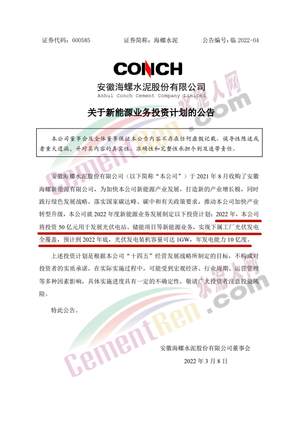 3月8日,安徽海螺水泥股份有限公司發(fā)布《關(guān)于新能源業(yè)務(wù)投資計(jì)劃的公告》稱,2022年,海螺水泥將投資50億元用于發(fā)展光伏電站、儲能項(xiàng)目等業(yè)務(wù),實(shí)現(xiàn)下屬工廠光伏發(fā)電全覆蓋;預(yù)計(jì)到2022年底,光伏發(fā)電裝機(jī)容量可達(dá)1GW,年發(fā)電能力10億度。