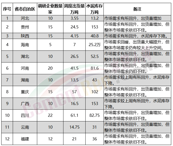 據(jù)水泥人網(wǎng)信息中心重點調(diào)研的12個區(qū)域數(shù)據(jù)來看,近一周內(nèi)出貨量有所增加,水泥庫存下降明顯,但是絕大多數(shù)區(qū)域整體市場需求仍呈現(xiàn)低迷狀態(tài)。甚至有個別企業(yè)調(diào)價后,出貨量大幅下降。更多區(qū)域出現(xiàn)市場高價“空轉(zhuǎn)”現(xiàn)象。