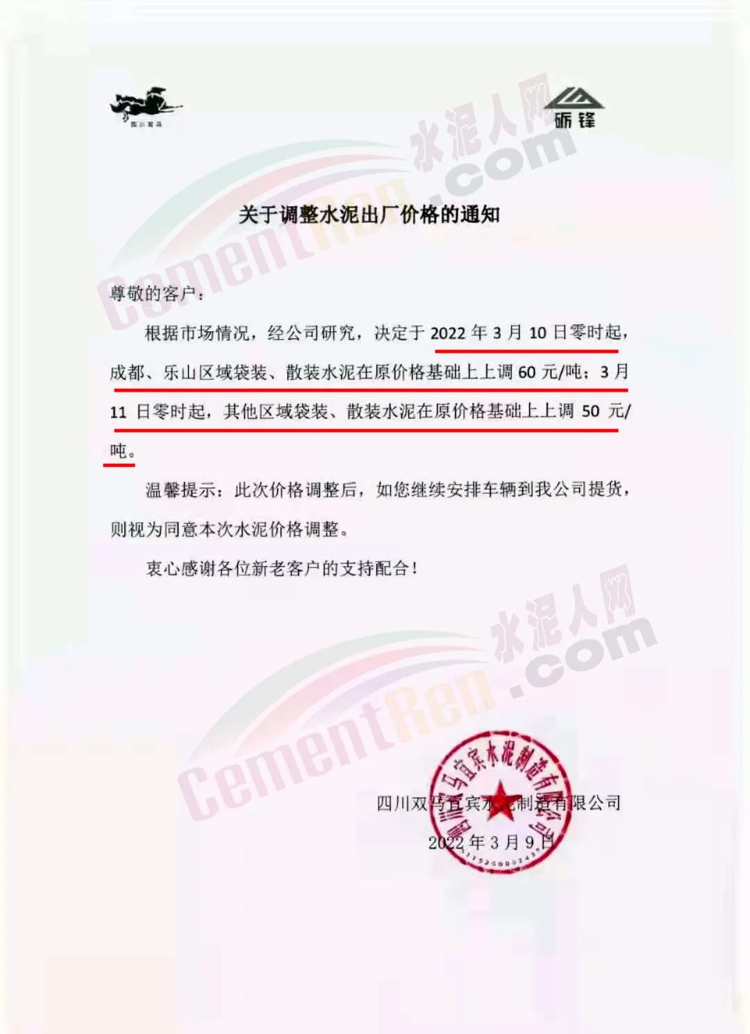 四川宜賓主要品牌企業(yè)通知,根據(jù)目前市場形勢和公司實際情況,經(jīng)公司研究決定從3月11日8時起,對所有片區(qū)所有品種水泥及熟料在原價基礎(chǔ)上上調(diào)50元/噸。