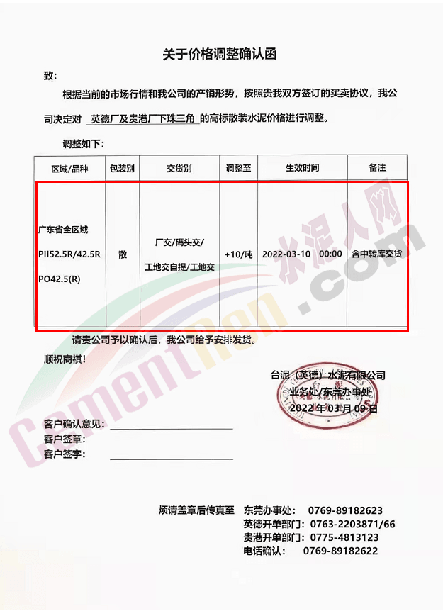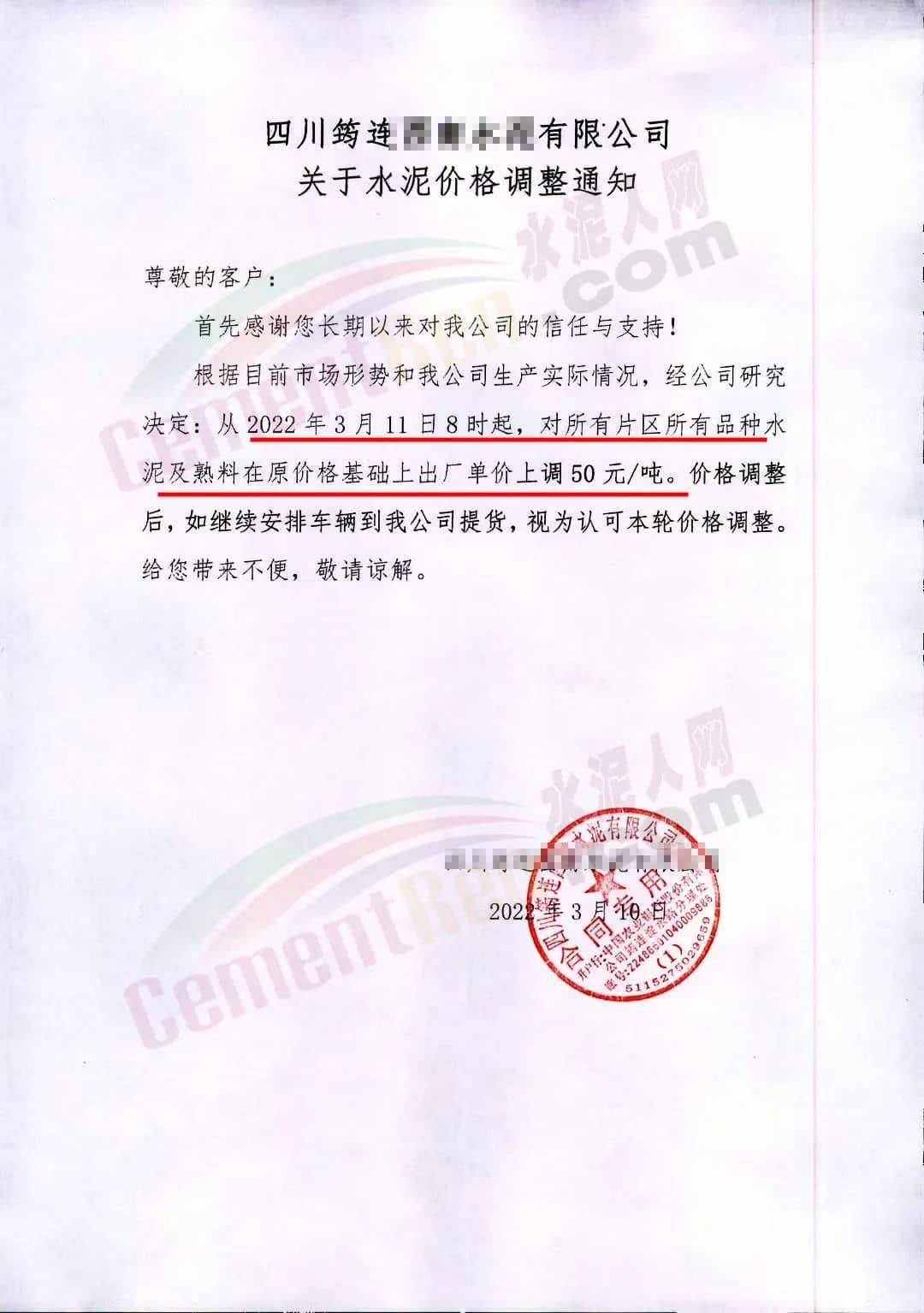 因原材料成本大幅上漲,根據(jù)目前市場行情,經(jīng)公司研究決定,自2022年3月11日零時起我司發(fā)往各區(qū)域的各品種各型號水泥出廠單價上調(diào)70元/噸。