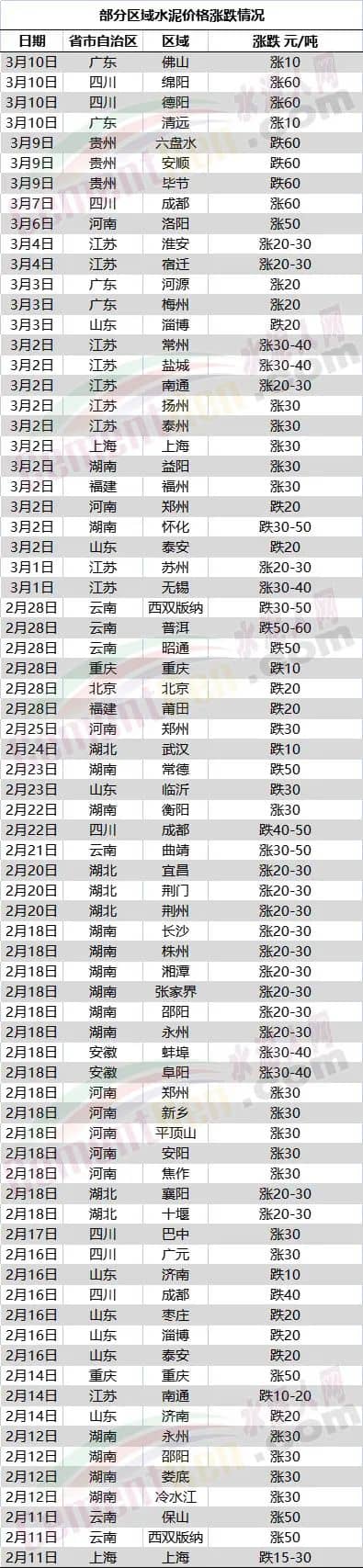 ?四川成都區(qū)2月份先后兩次下跌80-90元/噸,近期上調(diào)60元/噸;云南西雙版納2月內(nèi)漲50元/噸,跌30-50元/噸;江蘇南通漲20-30元/噸,跌10-20元/噸;河南鄭州漲30元/噸,跌50元/噸;上海漲30元/噸,跌15-30元/噸……