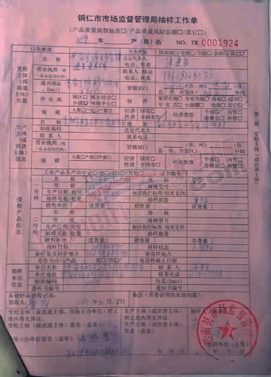 圖:銅仁市市場監(jiān)管管理局抽樣工作單