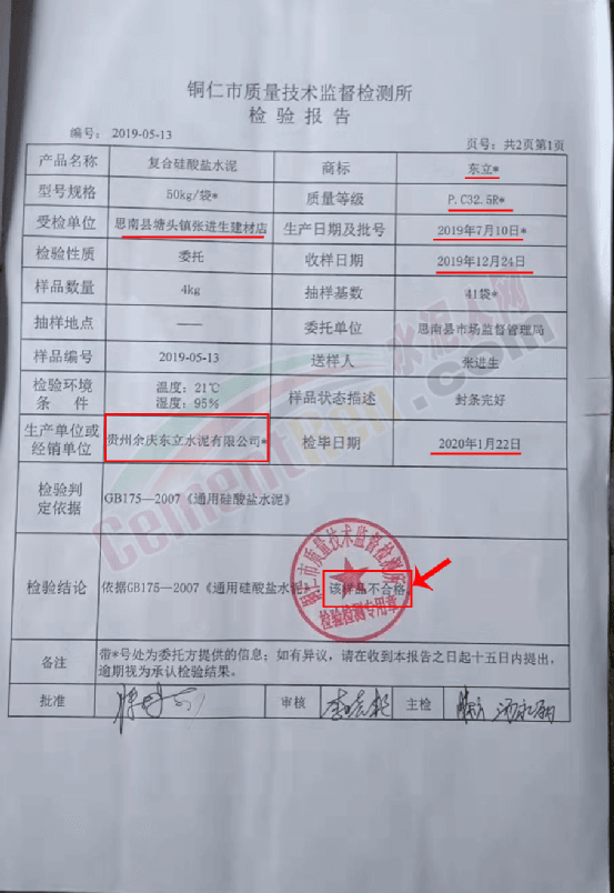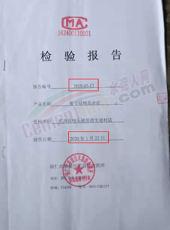 依據(jù)張進(jìn)生提供銅仁市質(zhì)量技術(shù)監(jiān)督檢測所2019-05-13檢驗(yàn)報(bào)告顯示,自思南縣塘頭鎮(zhèn)張進(jìn)生建材店抽樣的一個(gè)批次東立牌P.C32.5R復(fù)合硅酸鹽水泥不合格。產(chǎn)品生產(chǎn)經(jīng)單位為貴州余慶東立水泥有限公司。生產(chǎn)日期及批號為2019年7月10日,收樣日期為2019年12月24日 ,檢畢日期為2020年1月22日。