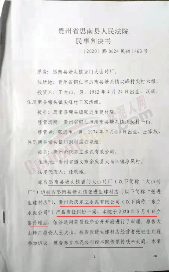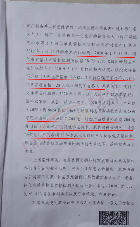 2020年3月27日把檢驗(yàn)報(bào)告及市場監(jiān)督管理取樣的經(jīng)過傳給了生產(chǎn)企業(yè)相關(guān)負(fù)責(zé)人。因遲遲未收到答復(fù),磚廠一紙?jiān)V狀將銷售者思南縣塘頭鎮(zhèn)張進(jìn)生建材店及東立水泥廠告上法庭。