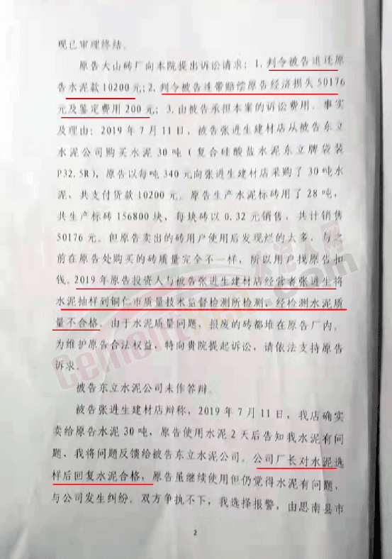 據(jù)其講述,曾于2019年7月11日從貴州余慶東立水泥廠有限公司購買30噸東立牌PC32.5R水泥,并以340元/噸的價(jià)格賣給了思南縣塘頭鎮(zhèn)巖門大山磚廠。磚廠用兩天水泥后,覺得水泥質(zhì)量有問題。接到磚廠反饋后張進(jìn)生便與東立牌水泥經(jīng)銷商聯(lián)系,并將此事反饋給了生產(chǎn)企業(yè)東立水泥相關(guān)負(fù)責(zé)人。