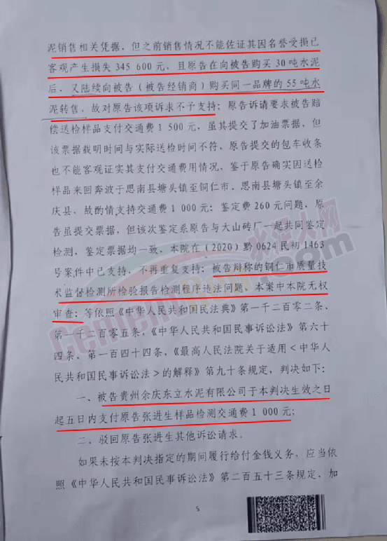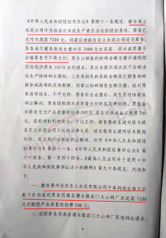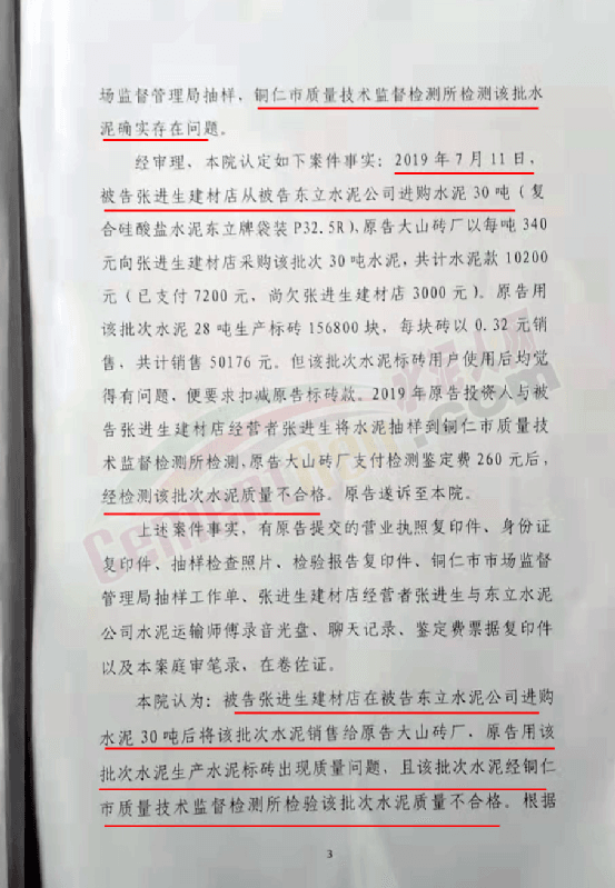 法院判決書提到,被告張進(jìn)生建材店在被告東立水泥公司進(jìn)購水泥30噸后將該批次水泥銷售給原告大山磚廠,原告用該批次水泥生產(chǎn)水泥標(biāo)磚出現(xiàn)質(zhì)量問題,且該批次水泥經(jīng)銅仁市質(zhì)量技術(shù)監(jiān)督檢測所檢驗(yàn)該批次水泥質(zhì)量不合格。