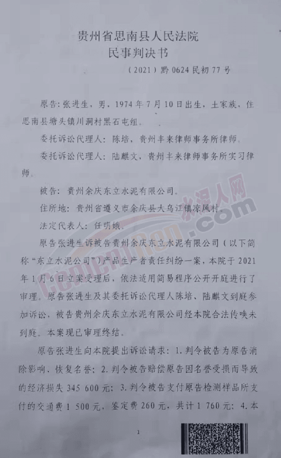 貴州省思南縣人民法院民事判決書顯示東立水泥公司庭審后提交答辯狀辯稱,原告名譽(yù)是否受損與被告無因果關(guān)系、原告要求被告恢復(fù)名譽(yù)、賠償損失無事實(shí)和法律依據(jù);因樣品檢測程序違法,對檢測報(bào)告不予認(rèn)可,該檢測報(bào)告也不應(yīng)被法院采納; 原告主張的經(jīng)濟(jì)損失345600元的請求權(quán)基礎(chǔ)不明,且并未提供該損失因水泥質(zhì)量導(dǎo)致,不應(yīng)支持,請依法駁回原告訴訟請求。