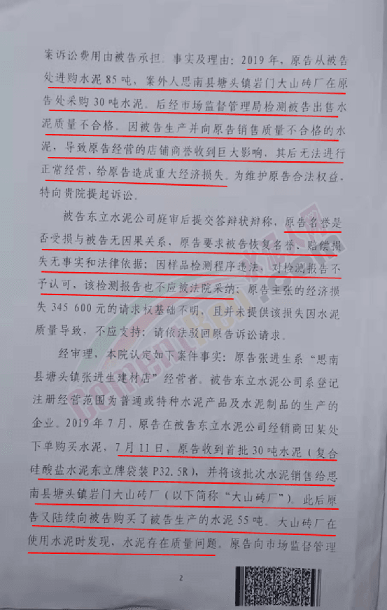雖法錘落下,事情卻并未到此結(jié)束,因銷售東立水泥權(quán)益受損,張進(jìn)生向法院起訴,要求東立水泥消除影響,恢復(fù)其名譽(yù),并要求賠償因名譽(yù)權(quán)受損而導(dǎo)致的經(jīng)濟(jì)損失。
