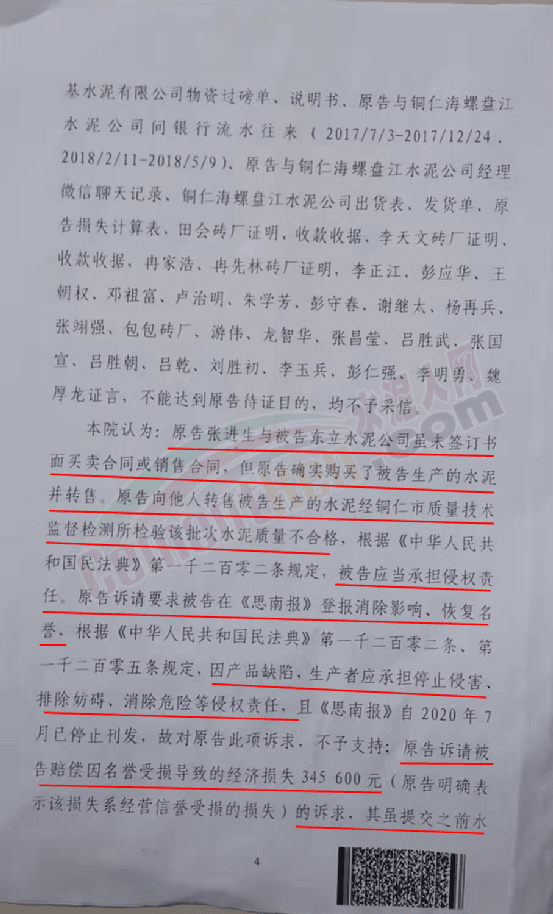 法院認(rèn)為,原告張進(jìn)生與被告東立水泥公司雖未簽訂書面買賣合同或銷售合同、但原告確實(shí)購買了被告生產(chǎn)的水泥并轉(zhuǎn)售。原告向他人轉(zhuǎn)售被告生產(chǎn)的水泥經(jīng)銅仁市質(zhì)量技術(shù)監(jiān)督檢測所檢驗(yàn)該批次水泥質(zhì)量不合格,根據(jù)《中華人民共和國民法典》第一千二百零二條規(guī)定,被告應(yīng)當(dāng)承擔(dān)侵權(quán)責(zé)任。原告訴請要求被告在《思南報(bào)》登報(bào)消除影響、恢復(fù)名譽(yù)、根據(jù)《中華人民共和國民法典》第一千二百零二條、第一千二百零五條規(guī)定,因產(chǎn)品缺陷,生產(chǎn)者應(yīng)承擔(dān)停止侵害、排除妨礙、消除危險(xiǎn)等侵權(quán)責(zé)任且《思南報(bào)》自 2020年7 月已停止刊發(fā),故對原告此項(xiàng)訴求、不予支持;