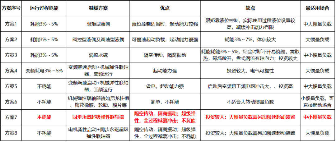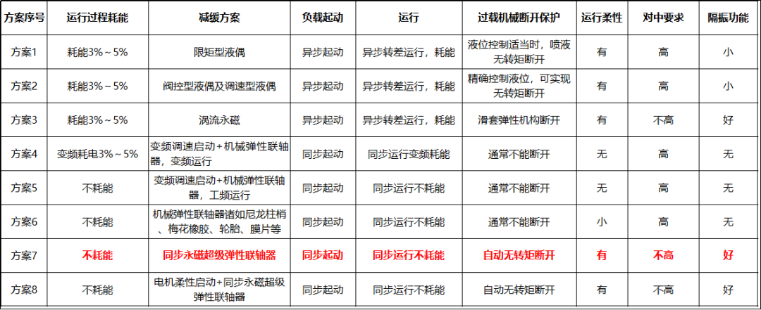 從上表可以看出,異步起動(dòng)轉(zhuǎn)差運(yùn)行類的柔性聯(lián)軸器存在3%~7%耗能,在選型過程應(yīng)盡量避免。柔性聯(lián)軸器盡量選用上表后四種減緩沖擊方案!同步運(yùn)行類聯(lián)軸器運(yùn)行過程不耗能,是首選的減緩沖擊方案。傳統(tǒng)的機(jī)械類同步聯(lián)軸器,由于其彈性減緩沖擊能力有限,單獨(dú)使用通常僅適用小慣量負(fù)載;同步永磁超級彈性聯(lián)軸器由于其超級彈性變形(7.5~15度,最大90度),減緩沖擊能力顯著增強(qiáng),使同步聯(lián)軸器成功應(yīng)用到中等慣量負(fù)載,為節(jié)能傳動(dòng)提供了一全新產(chǎn)品,也是唯一入選國家發(fā)改委《低碳目錄》的聯(lián)軸器。