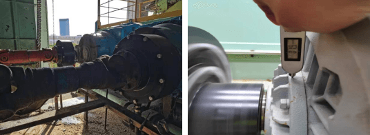 1、振動(dòng)大幅減?。ìF(xiàn)場測量振動(dòng)值:電機(jī)端水平2.3 mm/s,垂直0.9 mm/s,軸0.2 mm/s;減速機(jī)端水平0.4 mm/s,垂直0.2 mm/s,軸0.4mm/s)。