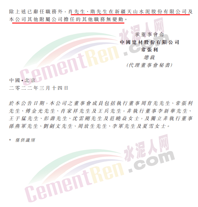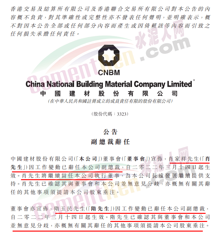 中國建材公告,肖家祥因工作變動(dòng)已辭任公司副總裁,自2022年3月14日起生效。肖將繼續(xù)留任公司執(zhí)行董事,為公司長遠(yuǎn)發(fā)展繼續(xù)提供支持。董事會(huì)亦宣布,隋玉民因工作變動(dòng)已辭任公司副總裁,自2022年3月14日起生效。