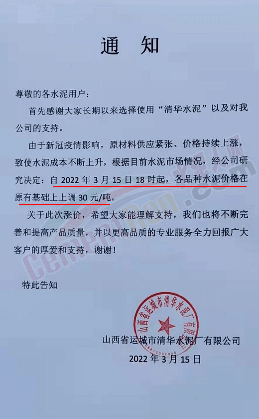 企業(yè)調(diào)價通知中提到,由于新冠疫情影響,原材料供應(yīng)緊張且價格持續(xù)上漲,疊加運費價格猛漲致使水泥成本不斷上升。